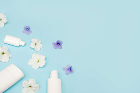 White bottles with dispenser with empty space for text on delicate flower blue background, mockup. Cosmetics, cream, lotion body, face skin care, Spa treatments salon, massage, copy space, flat lay