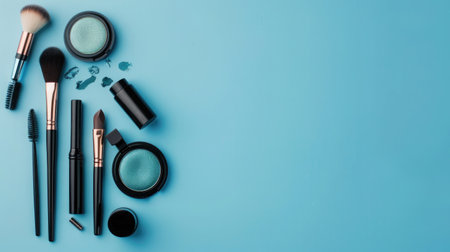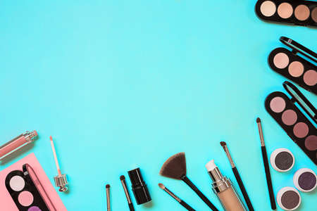 Makeup brushes and cosmetics on blue background. Flat lay, top view.