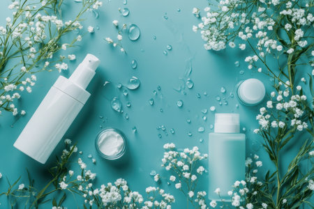 Various skincare products are artfully arranged among small white flowers and water droplets on a turquoise surface.
