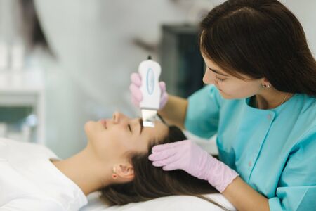 Cosmetologist, beautician making facial treatment with ultrasonic spatula to young woman, face skin scrubber treatment with ultrasonic spatula, facial cleansing procedure in beauty salon.