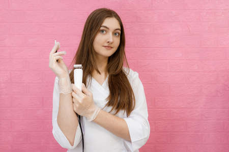 Beautician in the cosmetology office. Cosmetologist doctor with needle of electro epilation on pink background. Spa, beauty industry, treatment at salon, electrolysis.