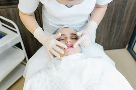 Close up of face of young teen girl with problem skin and acne, lying on the massage table in modern cosmetology clinic. Hands of female doctor beautician in gloves examines the skin of her patient