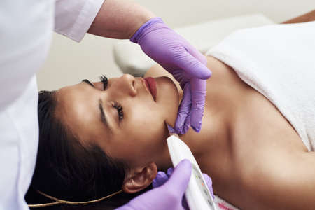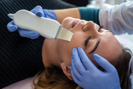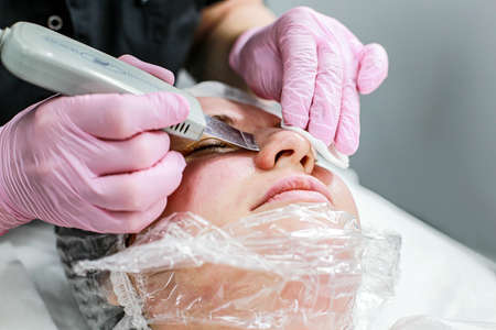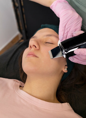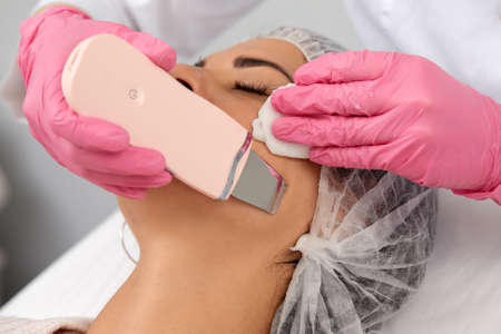 Cosmetologist, beautician making facial treatment with ultrasonic spatula to young woman, face skin scrubber treatment with ultrasonic spatula, facial cleansing procedure in beauty salon.
