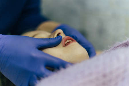 doctor's hands in white gloves touch the lips, plastic surgery, contour lip surgery, hyaluronic acid, cute caucasian girl, Cosmetic rejuvenating facial treatment.