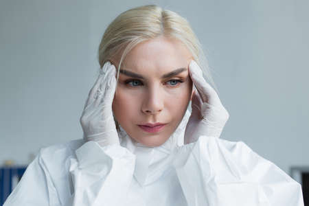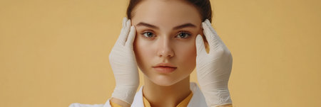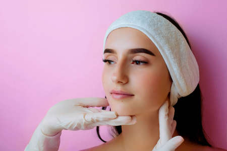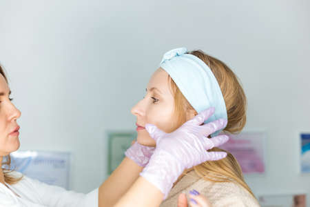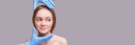 Doctor hands in protective medical gloves. Derma test. Prepare operation consultation. Pretty young woman. Face treatment. Blepharoplasty or rhinoplasty clinic. Cosmetology concept. Banner. Copyspace