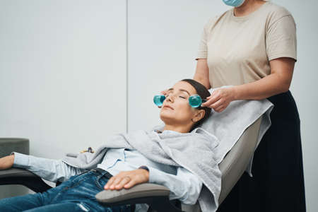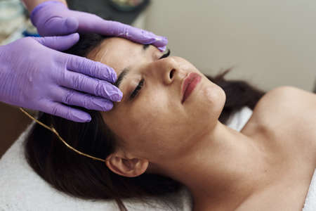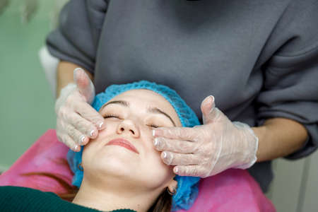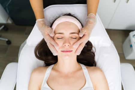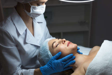 Cosmetologist preparing to doing cosmetic facial treatments for the young woman.