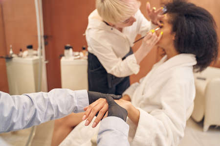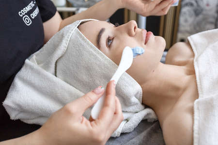 Russia, Moscow, 18 May 2019. Closeup picture of cosmetologist making cream mask to a lovely girl in a beauty parlour.