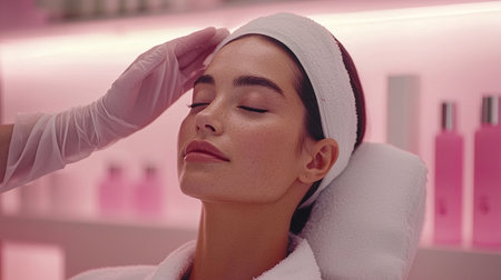 Woman receiving a spa facial in a tranquil room with pink lighting
