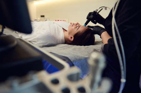 Beautician woman resurfacing session on female patient using beauty device laser CO2 fractional. Concept of rejuvenation and anti-aging procedures in spa.