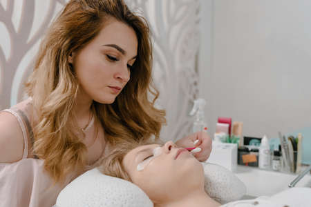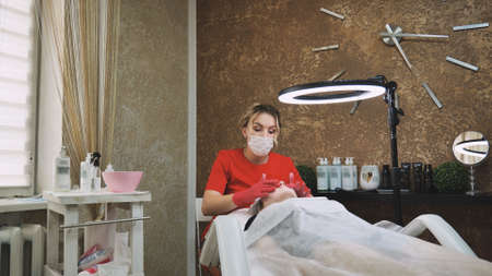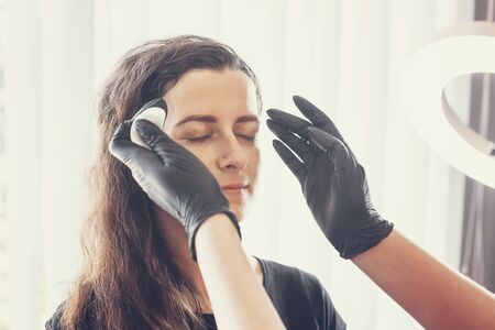 Beautician preparing model for eyebrow lamination procedure at the beauty salon.