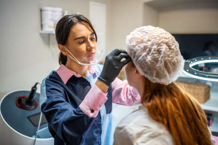 Eyebrow master forms and paints over the eyebrows of a red-haired girl with freckles with a brush. Portrait of a young woman in the process of dyeing her eyebrows. Free space for text