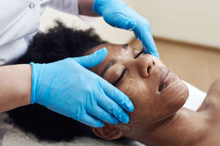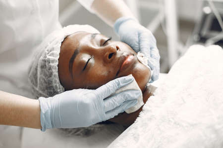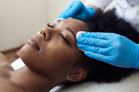 The cosmetologist cleanses with a tonic the face skin of a beautiful, young woman in a beauty salon. The dark-skinned model lies on the couch at the beautician
