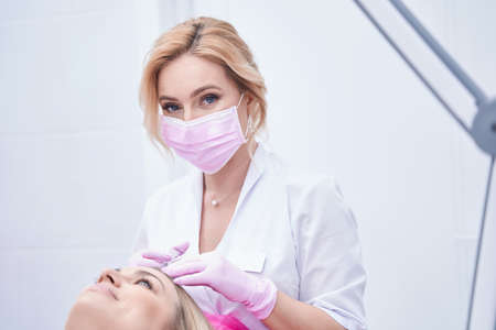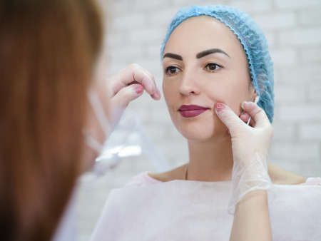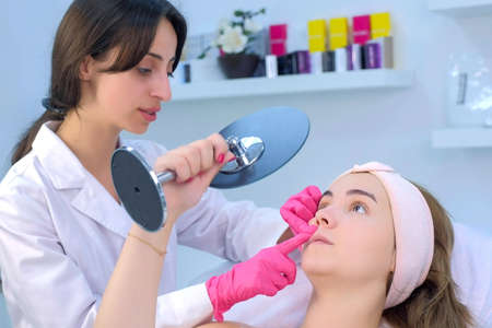 Decorative cosmetology. Permanent lip makeup. Female beautician examining lady face.