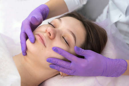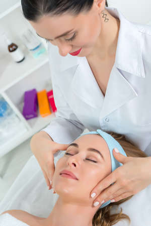 Face massage. Beautiful caucasian young white woman having a facial massage with closed eyes in a spa salon
