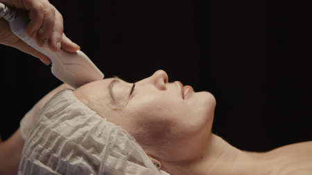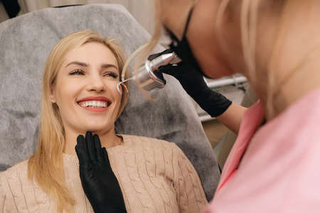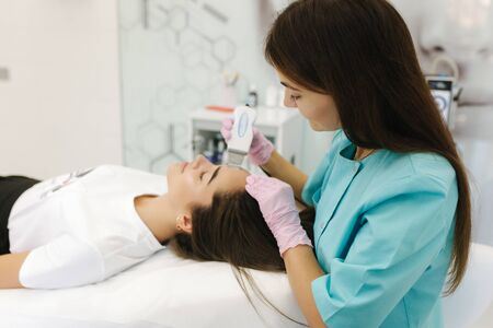 A woman makes an ultrasonic cleaning of the face and skin to a client. Modern equipment. Young pretty woman receiving treatments in beauty salons and lying on the couch.