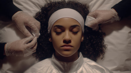 A close-up shot of a young woman with her eyes closed, wearing a white headband, as gloved hands carefully attend to her face, suggesting a medical or therapeutic context.
