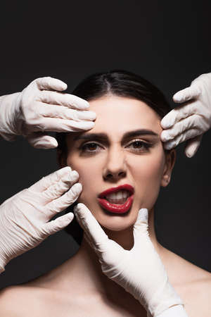 plastic surgeons in latex gloves touching face of brunette young woman isolated on black