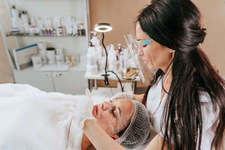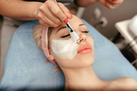 Facial cosmetic procedure in spa salon. The procedure for applying a mask to the face of a beautiful woman