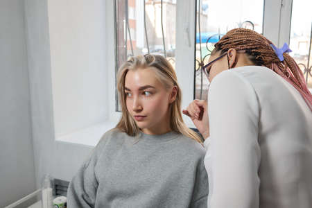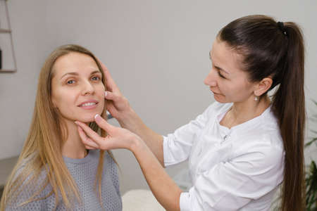 Client meeting dermatology cosmetician specialist in the room, discussion skin face problems and therapy methods. Woman showing zones for treatment. beautician with customer before procedure