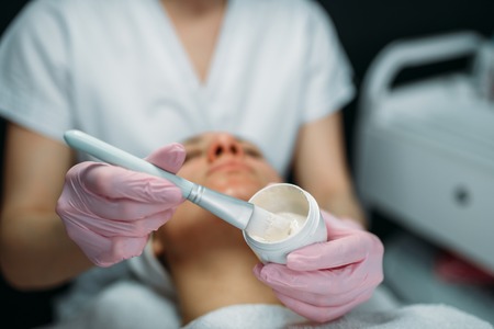 Girl enjoys cosmetic procedures in a cosmetology clinic. Beautician applies peeling on the face of a young girl.
