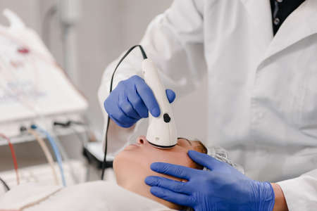Hands of doctor with ultrasonic scraber doing procedure of ultrasonic cleaning of teenage face in spa. Acne, problem skin treatment, peeling. Cosmetology, dermatology concept. Vertical, top view
