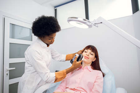 Young woman client lying on the couch in modern dermatology clinic, having face skin diagnostic. Professional young female african american dermatologist studying skin type using dermatoscope