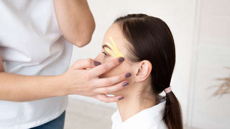 Specialist performing kinesio taping application on female face. alternative medicine concept.
