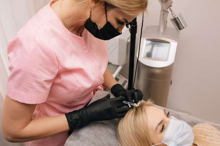 Woman getting injection into scalp, mesotherapy, hair loss therapy. Doctors wearing gloves in salon making medical manipulations to patient.