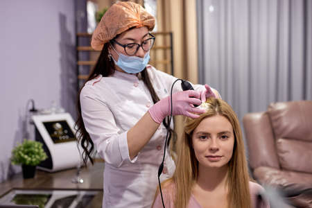 caucasian woman with thinning hair at examination of the scalp and hair with a microscope, getting trcihology examination. cosmetologist and client in modern cabinet