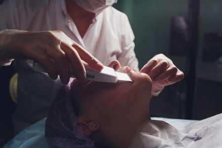 Hardware cosmetology. Beautician makes chromotherapy ultrasound cleaning the clients face. Skin pore cleansing. Anti-aging treatments. Spa. Non-invasive therapy.