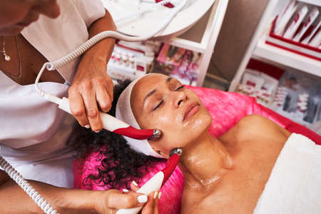 A dark-skinned model lies on the couch at the beautician and receives a microcurrent massage. Microcurrent therapy.