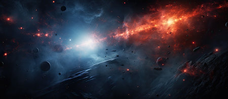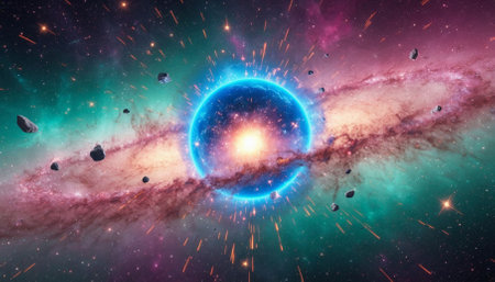 Abstract cosmic scene with glowing asteroids and colorful explosion in deep outer space.