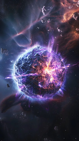 This image showcases a dynamic celestial event involving planetary fragmentation. Vivid oranges and blues dominate the composition, representing intense energy. The artwork portrays a cosmic scene with scattered debris amidst a starry background, suggesting vastness and power. Suitable for conceptual illustrations or science-related projects.