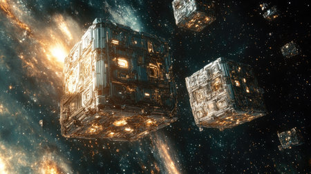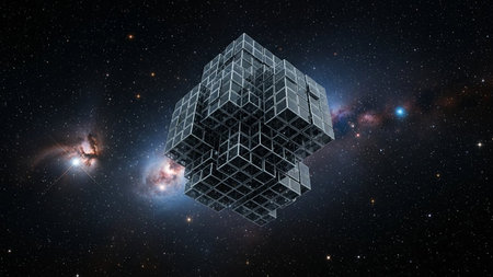 Sci-fi space station composed of metallic cubes, floating in outer space.