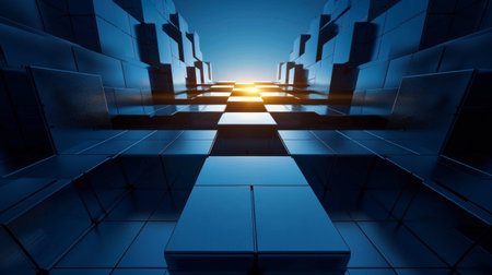 Modern abstract geometric blocks in blue tones with sunlight, representing technology, architecture, and futuristic design.