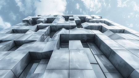 A photo showcasing a futuristic cloud-adorned sky above a modern architectural wall