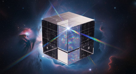 A highly reflective, mirrored cube dominates the frame, its surfaces etched with intricate circuit board patterns. The cube is illuminated by sharp beams of rainbow-colored light, which refract and reflect, creating highlights and spectral flares. It is positioned against a backdrop of deep space, featuring a vibrant, swirling nebula and numerous stars. The conveys a sense of advanced technology, data processing, and cosmic exploration.