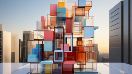 Colorful geometric shapes against a bright background The image showcases vibrant stacked cubes in pink, blue, and yellow, creating a modern and energetic atmosphere that captivates the viewer