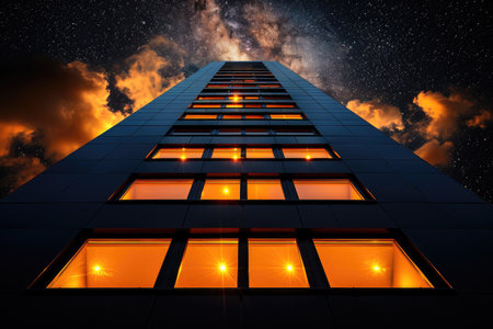 A low-angle view of a modern concrete building with a grid of windows, some lit orange and some dark blue, creating a contrasting geometric pattern.