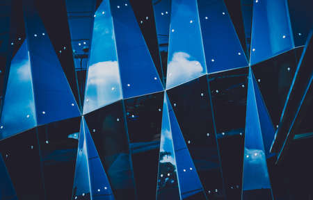 A striking modern building showcases vibrant reflections in its windows against a blue backdrop. Perfect for themes of urban design and architecture.