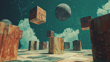 Surreal scene featuring floating cubes in a vibrant sky, accompanied by a distant moon and ethereal clouds, creating a captivating cosmic landscape.