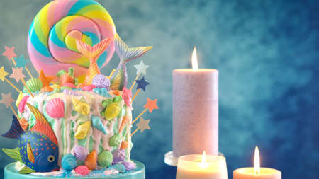 Mermaid theme candyland cake with colorful glitter tails, shells and sea creatures toppers for childrens, teens, novelty birthday and party celebrations.