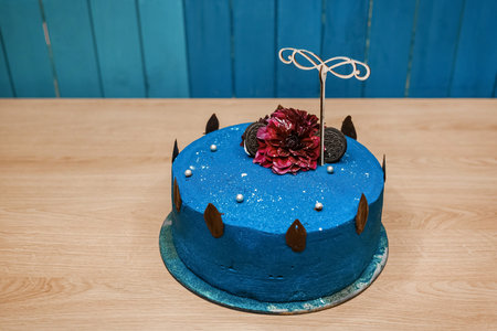 Festive sweet delicious cake with blue cream decorative birthday gift stands on a wooden table.