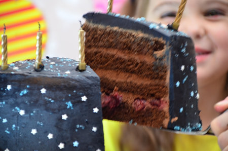 cut a big chocolate cake. happy little girl celebrates birthday, balloons and decorations. the candles on the cake blow out. Happy group of children having fun at birthday party