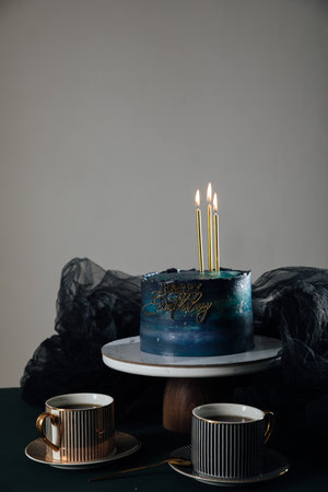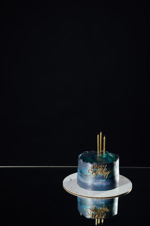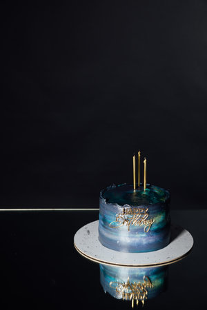 Birthday blue cosmic cake on festive background with text Happy Birthday
