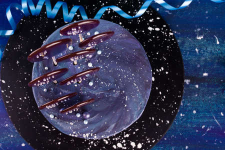 Small round mousse cake with galaxy mirror glaze and purple decorations