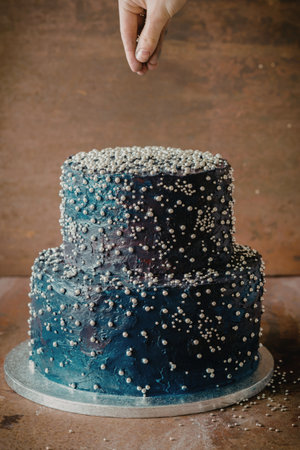 A close-up image of a two-tier cake decorated with a galaxy theme, featuring dark blue and purple icing with white sugar balls resembling stars. A hand is seen placing the final touches on the cake.