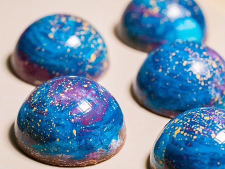 Set of colorful luxury handmade cosmic bonbons on white background. Exclusive handcrafted chocolate candies. Product concept for chocolatier