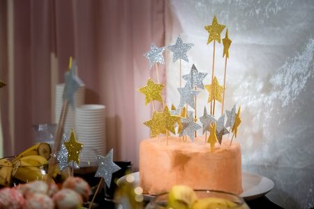 Delicious children's cake. A table with a cake for the birthday of the child. Culinary arts desserts. The art of cooking in sweet dishes.