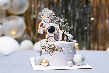 A festive cake at a children's space-themed party. The cake has a Russian inscription: Happy Birthday. There are balloons and a beautiful photo area in the background. The concept is a children's party.